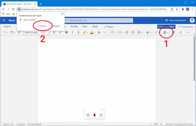 5. Clique na opção “Ditar” no menu e clique em “Permitir” no aviso exibido no navegador.
