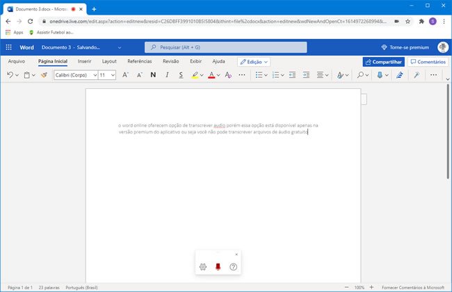 O Word online oferece a opção de transcrever áudio, porém, essa opção está disponível apenas na versão premium do aplicativo, ou seja, ele não permite transcrever arquivos de áudio gratuitamente.