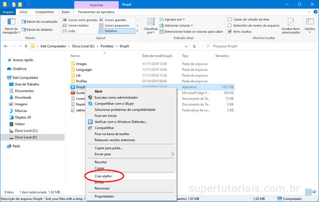 1. Abra a pasta onde está o arquivo EXE do programa, clique com o botão direito e escolha a opção “Criar atalho” para criar o atalho do programa. Derixe a pasta aberta e passe para o segundo passo.