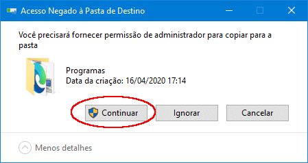 5. Clique em “Continuar” na mensagem exibida para copiar o atalho para a pasta.
