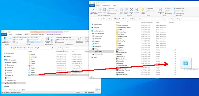 4. Em seguida, “arraste e solte” o atalho que você criou na pasta do Menu Iniciar que você abriu na segunda etapa. Opcionalmente você também pode copiar o atalho e colar na pasta do Menu Iniciar.
