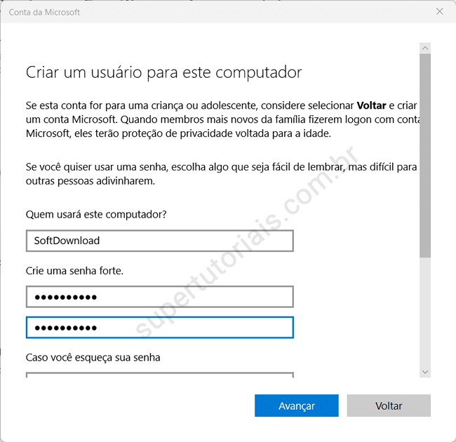 5. Se optou por criar uma conta local, insira um nome de usuário, uma senha e escolha as perguntas de segurança, para que você possa recuperar a conta de usuário, caso esqueça a senha do usuário.