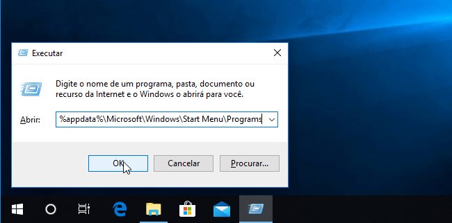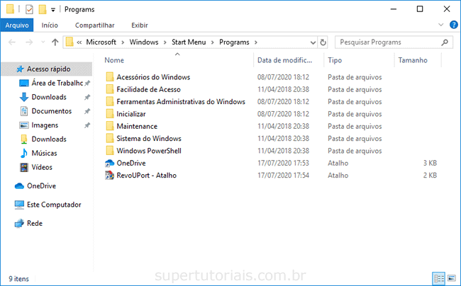 3 . Isso irá abrir a pasta do Menu Iniciar. Aqui você poderá simplesmente colar o atalho do programa ou então, criar uma pasta para o programa e colar o atalho dentro dela, para deixar mais organizado.