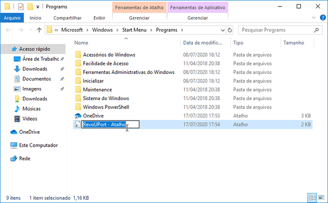 4. Por fim, você pode renomear o atalho para torná-lo mais amigável. Clique com o botão direito nele e selecione a opção “Renomear”. Em seguida, renomeie o atalho, removendo o escrito “atalho” dele.