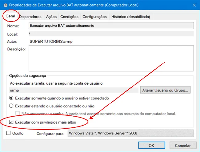 10. Se o arquivo BAT precisar ser executado como administrador, clique com o botão direito nele na lista, selecione “Propriedades” e, em “Geral”, marque a opção “Executar com privilégios mais altos”.