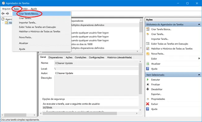 2. No Agendador de Tarefas, clique no menu “Ação > Criar Tarefa Básica”.