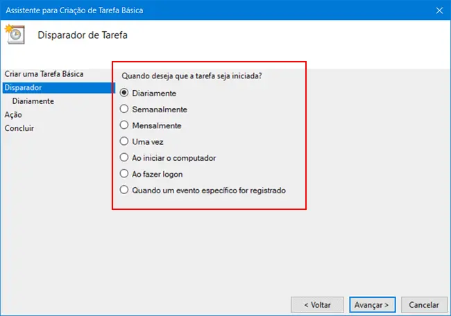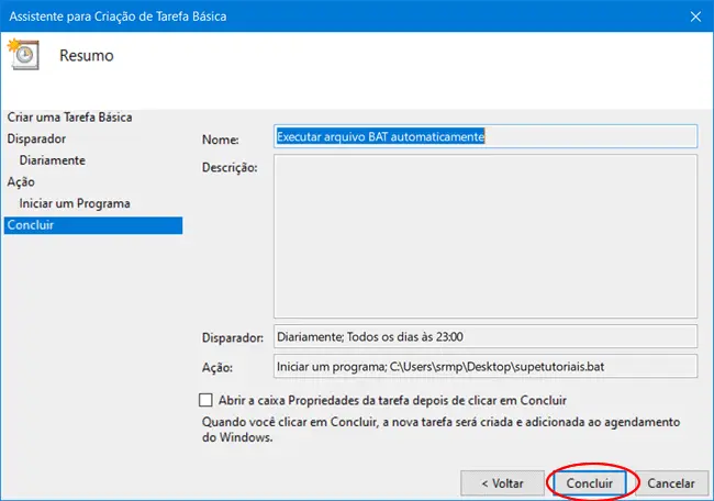 4. Na tela seguinte, defina quando deseja executar o arquivo de lote automaticamente.
