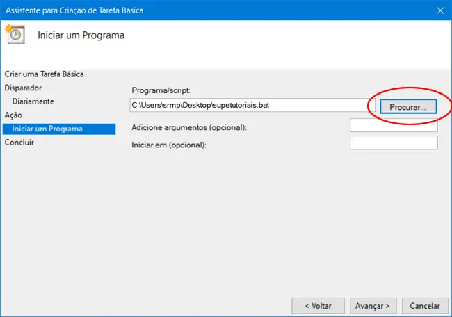 7. Clique em “Procurar” e selecione o arquivo .bat que deseja executar automaticamente.
