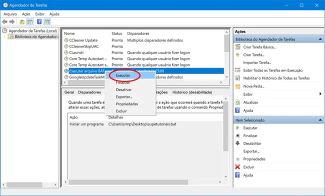 9. Uma vez feito isso, o arquivo de lote será executado automaticamente no horário agendado. Você pode localizar o agendamento na lista de tarefas, clicar com o botão direito e executá-lo para testar.