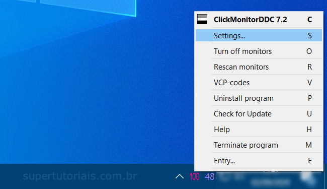 2. Uma vez instalado o programa, ele coloca dois ícones na bandeja do sistema (perto do relógio do Windows), um que representa o brilho da tela e outro o volume do áudio. Clique com o botão direito do mouse em um dos ícones e selecione “Settings” para abrir a janela de configuração do programa.