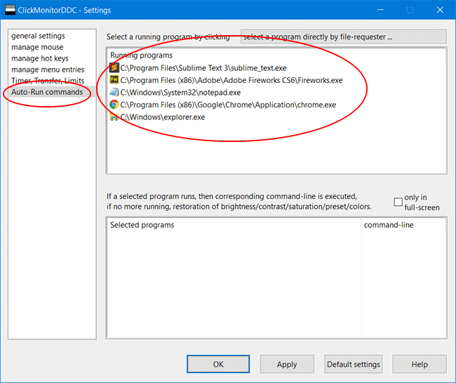 3. Nas configurações do ClickMonitorDDC, clique em “Auto-Run commands” e selecione o programa que deseja ajustar o brilho. Note que o programa precisa estar em execução para ser exibido na lista.