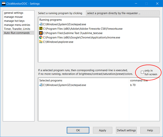 5. Por fim, desmarque a opção “Only in full-screen”, para que o brilho seja alterado sempre que você abrir o programa selecionado e não apenas quando você colocar a janela do programa em tela cheia.