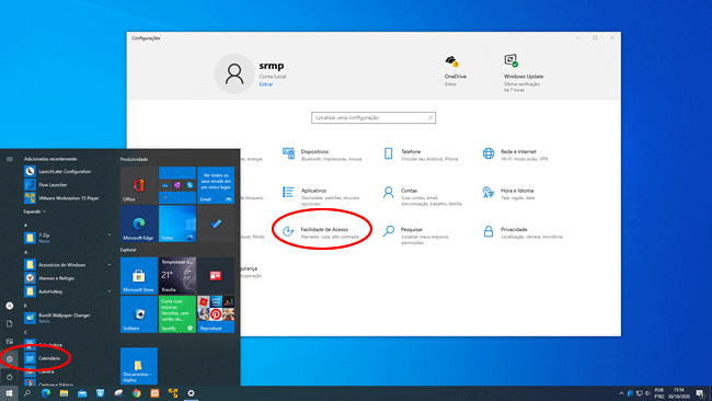 1. Abras as “Configurações” no Menu Iniciar e clique em “Facilidade de acesso“.