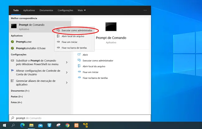 1. A primeira coisa que você precisa fazer é abrir o “Prompt de Comando” como administrador. Para isso, pesquise por “Prompt”, clique com o botão direito e selecione o “Executar como administrador”.