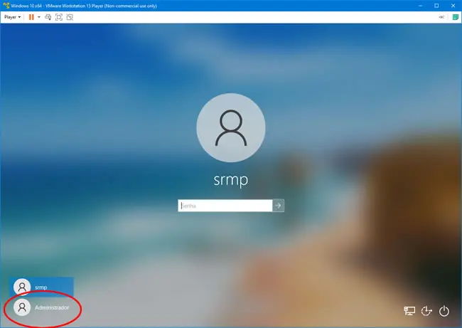 4. Pressione Ctrl+L para fazer logoff da conta de usuário que está usando e você deverá ver a conta de administrador como opção na tela de login. Para acessá-la, basta selecioná-la e pressionar Enter.