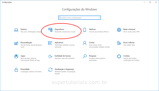 1. Pressione Windows + I para abrir as “Configurações” do Windows 10 e clique em “Dispositivos”.
