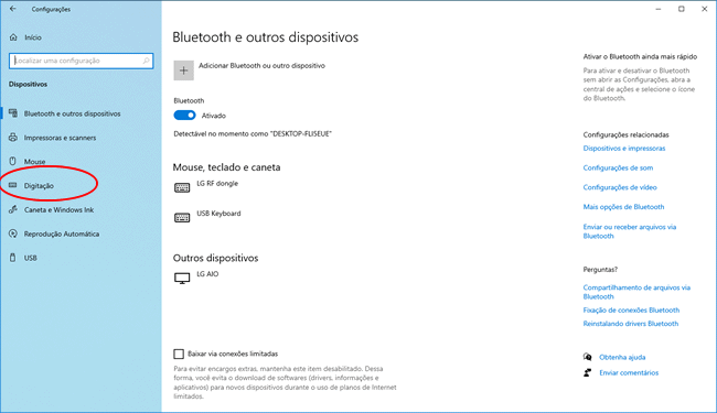 2. Na janela “Dispositivos”, clique na opção “Digitação” no menu lateral.