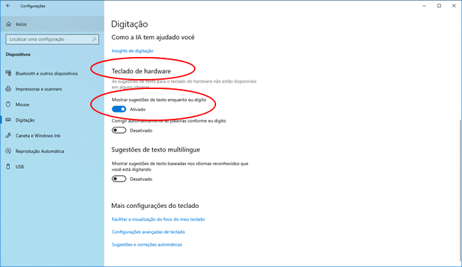 3. Localize “Teclado de hardware” e ative a opção “Mostrar sugestões de texto enquanto eu digito”.