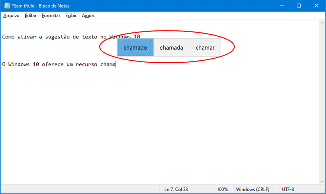 4. Para fazer um teste, abra o bloco de notas e comece a digitar. Assim que a barra de sugestão de texto aparecer, pressione a seta para cima para selecionar a primeira sugestão e use as setas para direta e esquerda para selecionar outras sugestões. Por fim, pressione “Enter” para colar a palavra.