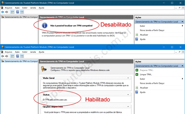 3. Depois de salvar as configurações na BIOS e reiniciar o PC, para confirmar se o TPM está ativo, pressione as teclas “Win+R” para abrir a caixa “Executar” do Windows, digite tpm.msc e clique “OK“. Na janela aberta, você pode ver se o TPM está ativo ou não em seu PC. Veja os exemplos abaixo.