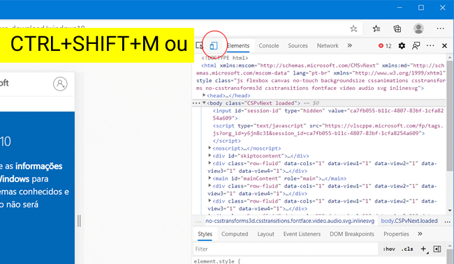 3. Em seguida, pressione Ctrl+Shift+M ou clique no ícone de celular indicado na imagem para abrir a barra de ferramentas do dispositivo, que permite visualizar a página como se fosse outro dispositivo.