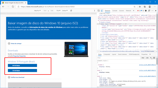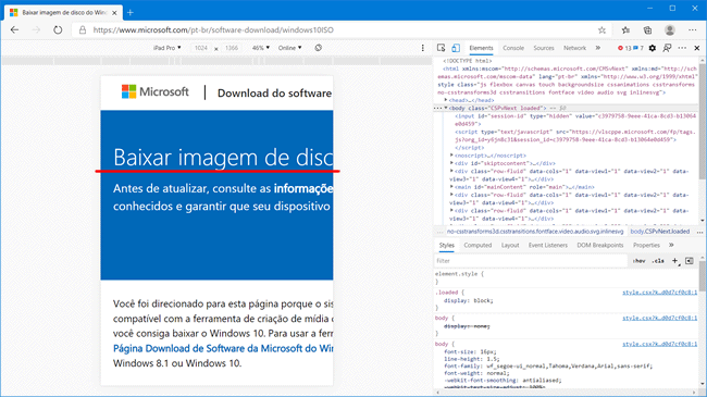 5. Por fim, pressione a tecla F5 para atualizar a página. Ao fazer isso, o site da Microsoft ira oferecer uma opção de você baixar o arquivo ISO do Windows 10, em vez da ferramenta de criação de mídia.