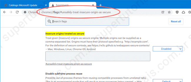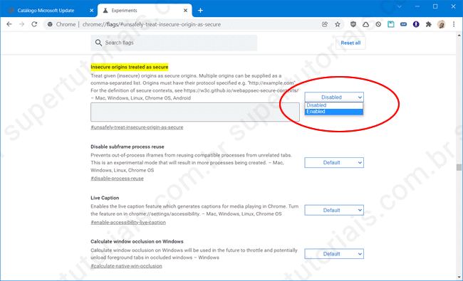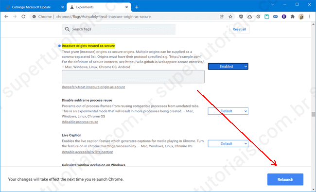 Nota: O nome da bandeira (flag) , que nesse caso é “Insecure origins treated as secure” já foi alterada algumas vezes. Se por acaso você não conseguir encontrar a opção usando o link disponibilizado no artigo, acesse o link chrome://flags e pesquise por uma palavra-chave relacionada, como “insecure”.