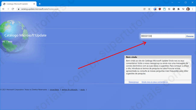 1. Acesse o site do catálogo Microsoft Update e use o campo “Procurar” para realizar a pesquisa pela atualização que pretende baixar usando o número KB da atualização, como, por exemplo, KB5001330.