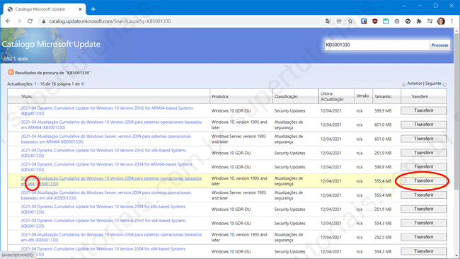 2. Em alguns casos, ele irá exibir a atualização para diferentes sistemas operacionais e arquiteturas, portanto, identifique a atualização correta para você, e clique no botão “Transferir”. Por exemplo, se você utiliza a versão de 64 bits do Windows, procure pela atualização que tem “x64” em seu nome.