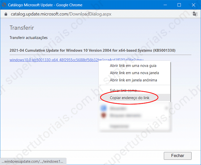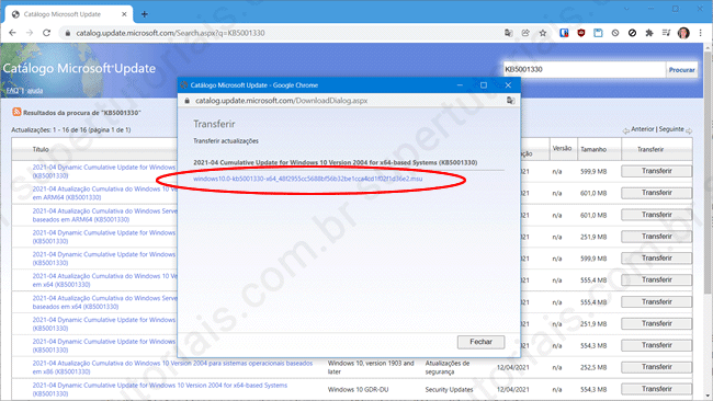 3. Ao clicar no botão “Transferir” de uma atualização, uma “janela pop-up” será exibida com o link de download da atualização. Clique nesse link para baixar o arquivo .msu da atualização para o seu PC.