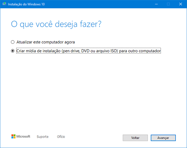 4. Espera novamente ele fazer os preparativos e na próxima tela, selecione a opção “Criar mídia de instalação (pen drive, DVD ou arquivo ISO para outro computador” e clique no botão “Avançar”.