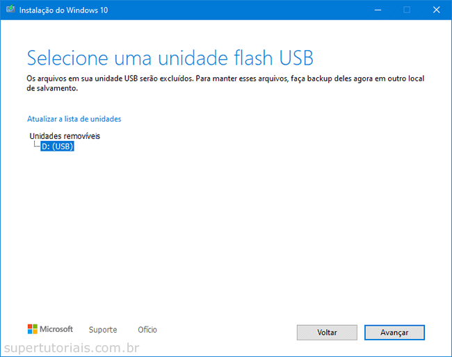 7. Conecte o pendrive com pelo menos 8GB no computador e clique em “Avançar”.