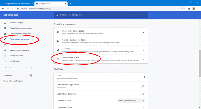 2. Em seguida, clique em “Privacidade e Segurança” e “Configurações do Site”.