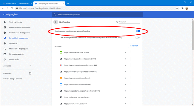 4. Para desativar completamente as notificações, desmarque a opção “Os sites podem pedir para enviar notificação”. Ao desabilitar a opção, os sites não poderão mais pedir para enviar notificação.