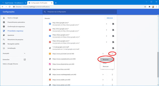 Você irá precisar fazer isso para todos os sites da lista que deseja bloquear. Infelizmente, o Chrome não oferece uma opção para bloquear todos os sites da lista com permissão para exibir notificações.