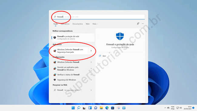 1. Pesquise por firewall e abra a opção “Windows Defender Firewall com segurança avançada”.