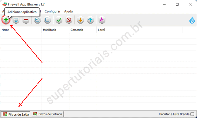 3. Certifique-se que você está na guia “Regras de saída, clique no botão (+) ou no menu “Arquivo > Adicionar aplicação” para inserir o programa que deseja bloquear na lista do Firewall App Blocker.