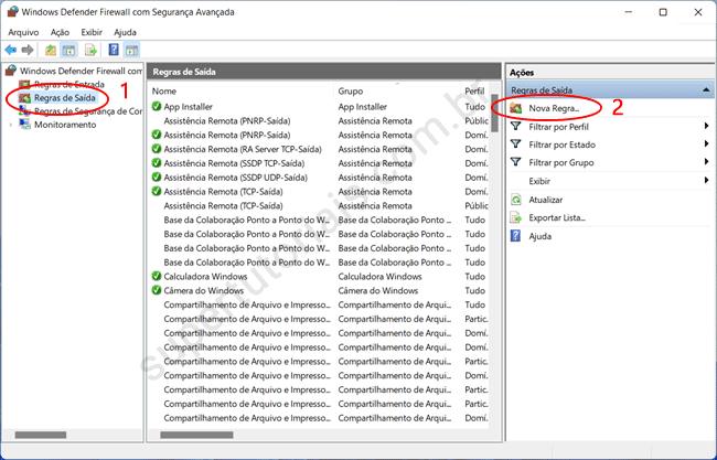 2. Clique em “Regras de Saída” do lado esquerdo e depois em “Nova Regra…” do lado direito.