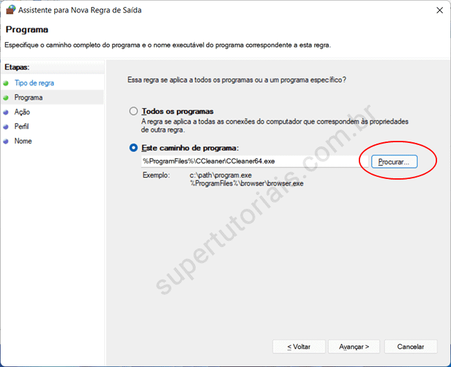 4. Clique em “Procurar” e selecione o arquivo executável (exe) do programa que deseja bloquear.