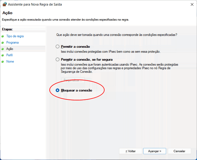 5. Marque a opção “Bloquear conexão” e clique em “Avançar”.
