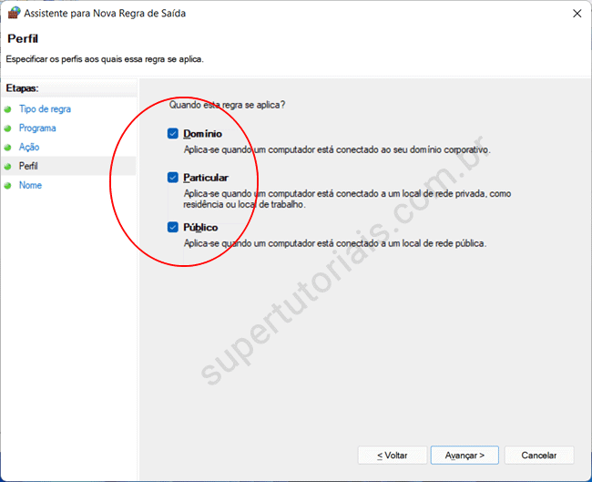 6. Marque as três caixas e clique para bloquear o acesso em todos os tipos de rede.