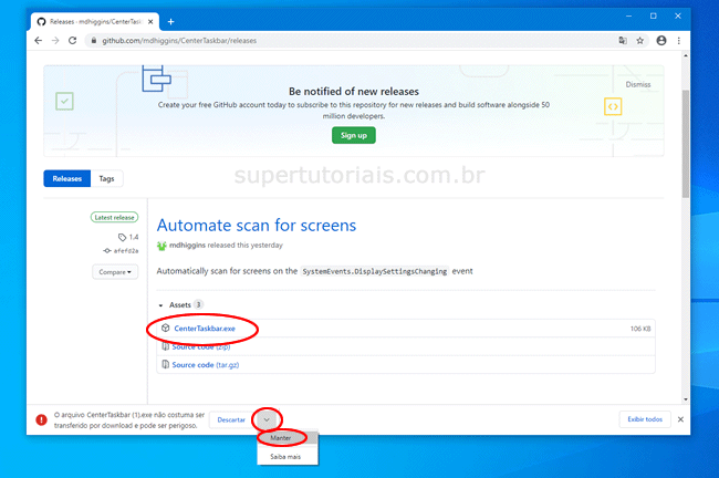 Nota: Apesar do alerta que o navegador exibe, o programa é seguro para usar. Você pode verificar aqui a análise do programa CenterTaskbar feita no VirusTotal com mais de 60 antivírus diferentes.