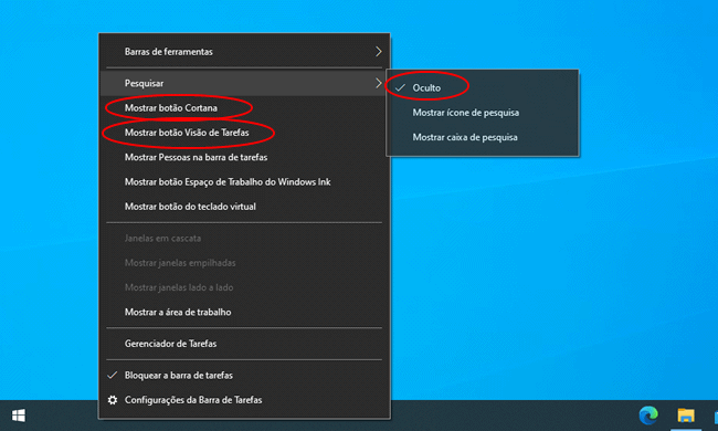 4. Alguns ícone não podem ser centralizados, por conta disso é interessante remover esses ícones. Para fazer isso, clique com o “botão direito” em qualquer local da barra de tarefas e desmarque as opções “Mostrar botão visão de tarefas”, “Mostrar botão Cortana” e clique em “Pesquisar > Oculto”.