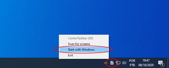 5. Ele também adiciona um ícone na bandeja do sistema. Clique com o botão direito nesse ícone e marque a opção “Start with Windows”, para o CenterTaskbar ser inicializado junto com o Windows.