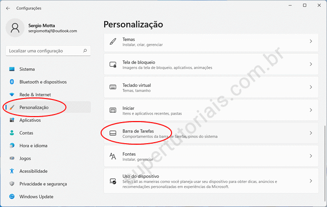 2. Em seguida, clique em “Personalização” na barra lateral, desça a página do lado direito da tela, encontre a opção “Barra de tarefas” e clique nela para ver a lista de opções de ajuste disponíveis.