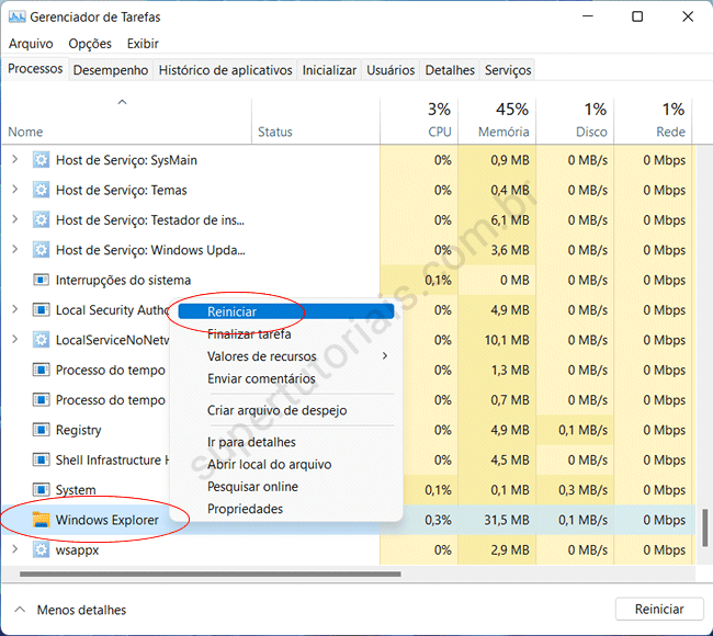 6. Por fim, reinicie o Windows Explorer para aplicar a alteração. Abra o Gerenciador de Tarefas com “Ctrl + Shift + Esc”, clique com o botão direito no Windows Explorer e selecione a opção “Reiniciar.”