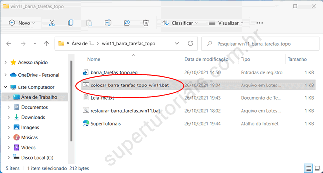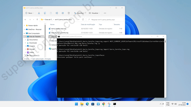 2. Clique duas vezes no arquivo colocar_barra_tarefas_topo_win11.bat. Primeiro, ele irá executar um backup da chave do registro que será editada, que será salvo na mesma pasta do script. Em seguida, ele importará as informações contidas no arquivo barra_tarefas_topo.reg para o registro do Windows.