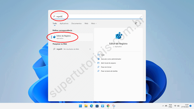 1. Pequise por regedit no menu Iniciar e abra o Editor do Registro.