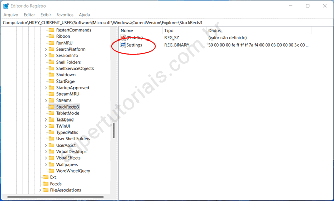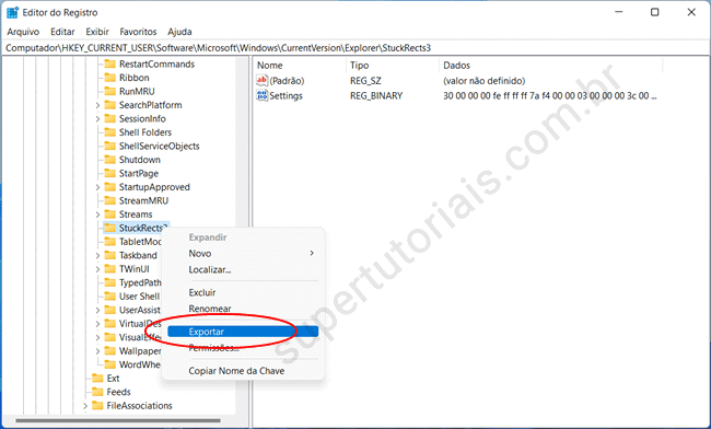 3. Clique com o botão direito na chave StuckRects3 e selecione a opção “Exportar”. Salve um arquivo REG na área de trabalho com um nome fácil de identificar, como bkp_registro_win11. Esse arquivo é um backup da chave de registro que será modificado, que você poderá restaurar caso algo dê errado.