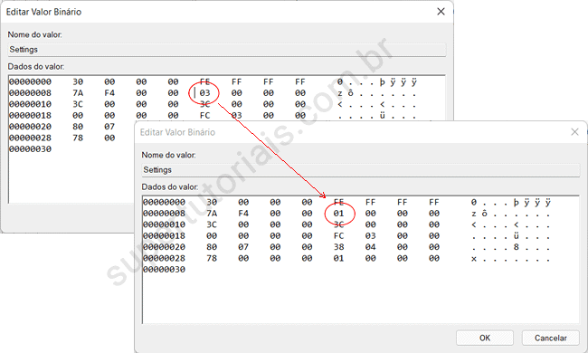 5. Na linha 0008, posicione o cursor do mouse na quinta coluna, antes do valor 03 e pressione a tecla “Del” para excluir o valor 03. Em seguida, digite 01 no mesmo local e clique em “OK” e feche o editor.